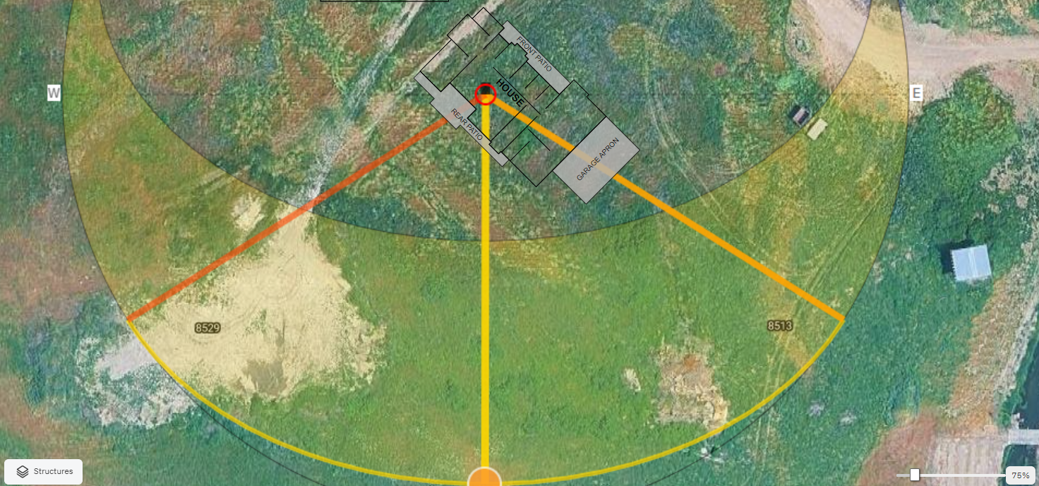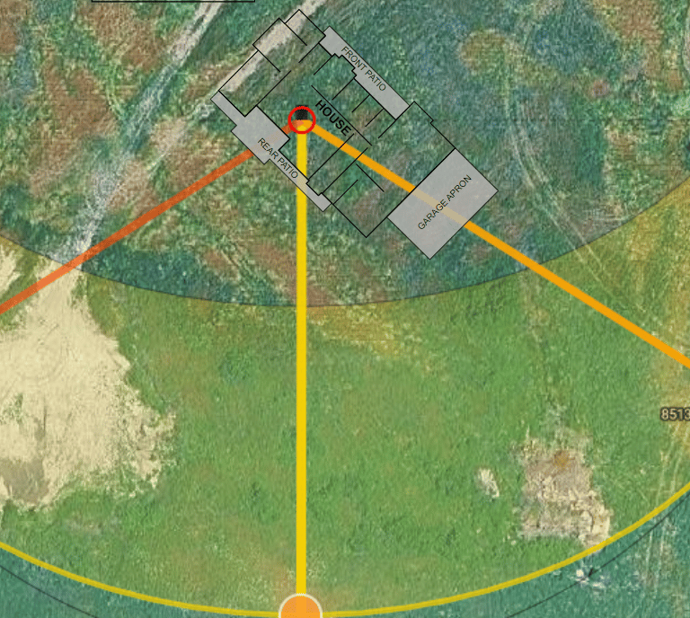 We did this by building a model of their house and using a sun mapping app to see how the sun would hit the house in the summer and the winter, allowing us to pinpoint the right amount of offset to benefit from passive solar light/heat, avoid a baking summer patio, and still drive up to the front of the house.